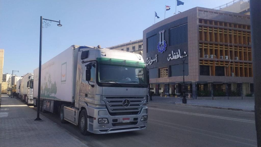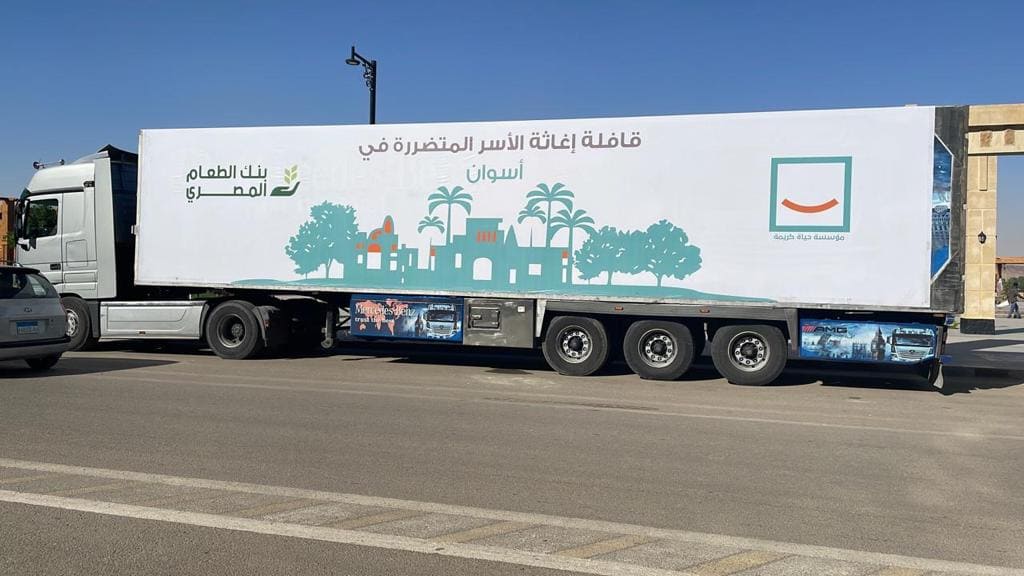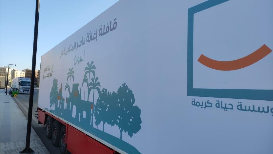 بالصور ..مؤسسة حياة كريمة ترسل قوافل للمساعدات الإنسانية والغذائية بالتعاون مع بنك الطعام المصرى إلي أسوان