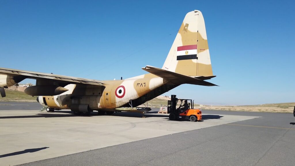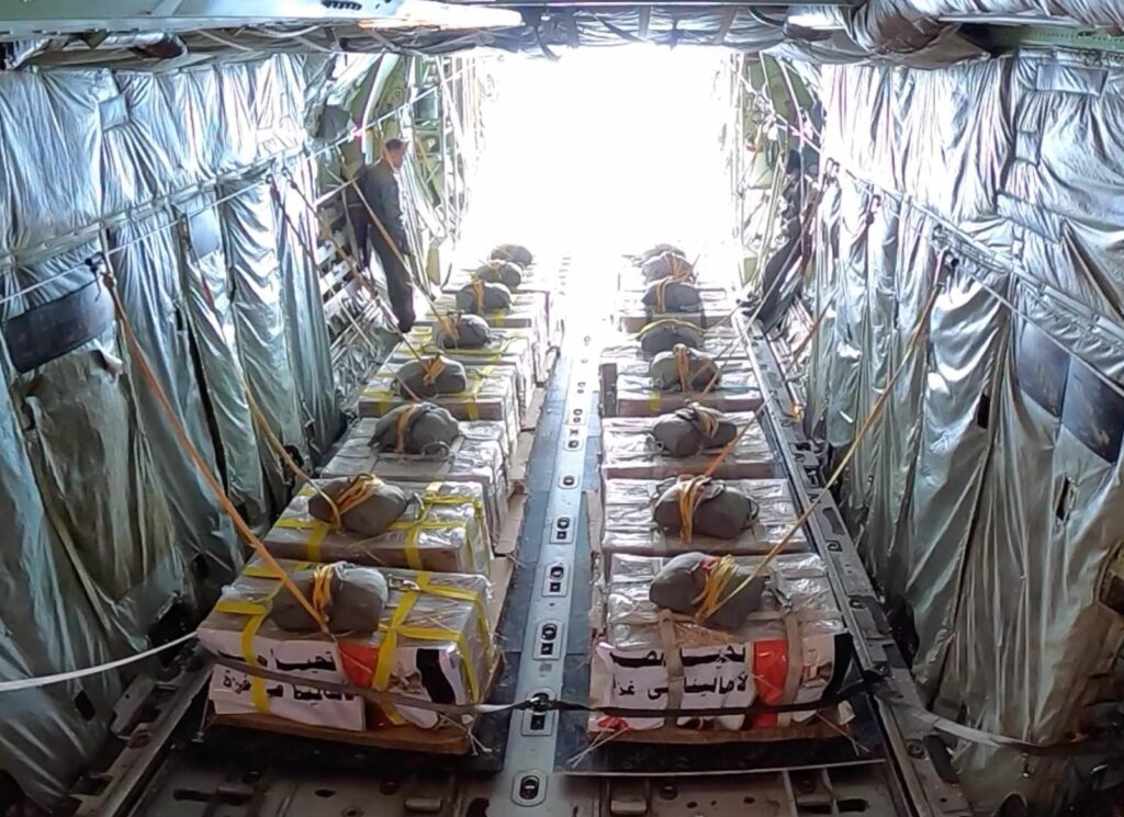 فى إطار تقديم كافة أوجة الدعم والمعاونة للأشقاء الفلسطينيين وتنفيذاً لتوجيهات السيد الرئيس / عبدالفتاح السيسى رئيس الجمهورية القائد الأعلى للقوات المسلحة ، كثفت القوات الجوية المصرية بالتعاون مع نظيرتها من دولة الإمارات العربية المتحدة طلعاتها من مطار العريش على مدار يومى 15- 16 مارس 2024 لتنفيذ أعمال الإسقاط الجوى لأطنان من المساعدات الغذائية ومواد الإغاثة العاجلة على شمال قطاع غزة .