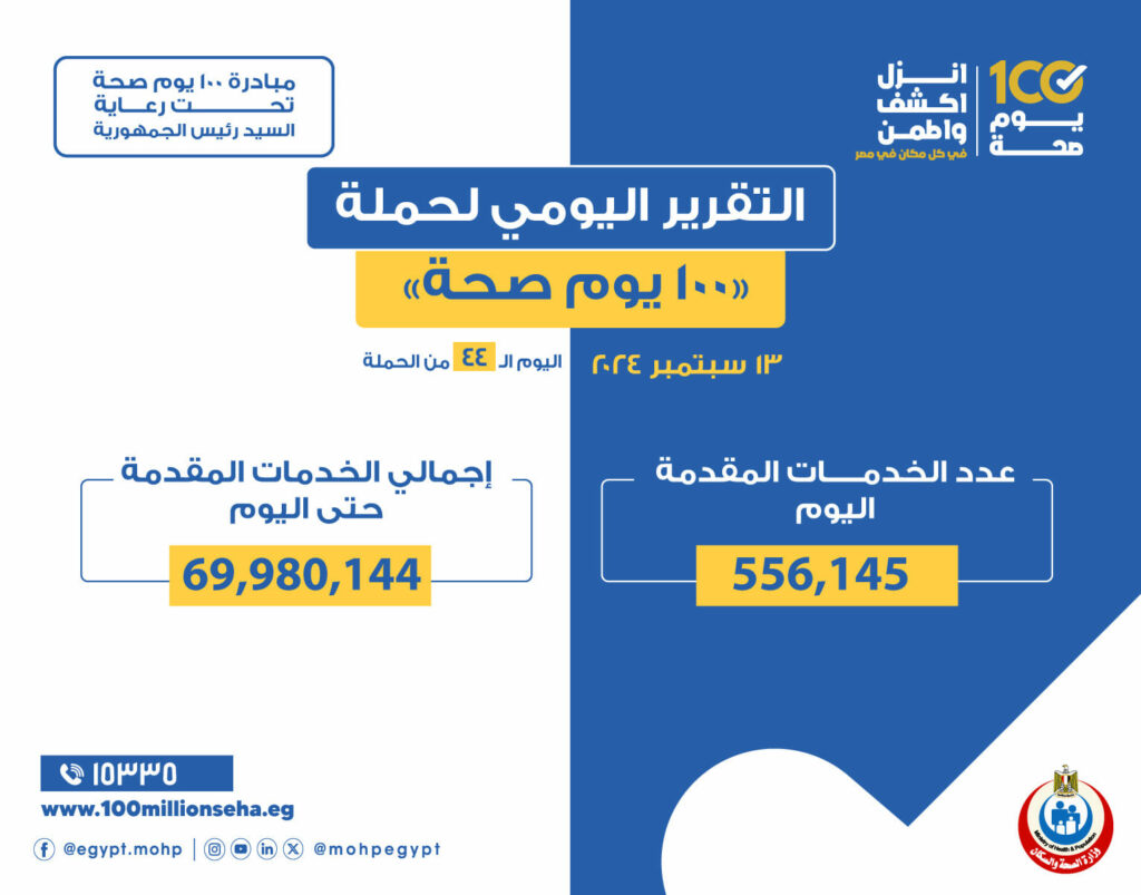 حملة «100 يوم صحة» قدمت أكثر من 69 مليون و980 ألف خدمات مجانية خلال 44 يوما