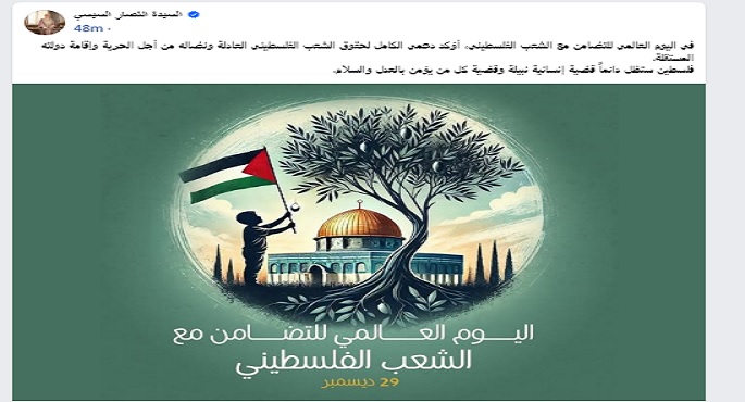 وقالت السيدة قرينة رئيس الجمهورية – في تدوينة على صفحتها الرسمية على مواقع التواصل الاجتماعي اليوم الجمعة – “في اليوم العالمي للتضامن مع الشعب الفلسطيني، أؤكد دعمي الكامل لحقوق الشعب الفلسطيني العادلة ونضاله من أجل الحرية وإقامة دولته المستقلة”.