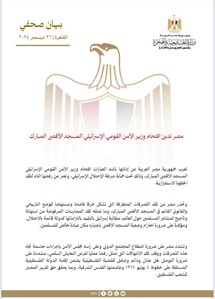 أدانت مصر، في بيان صادر عن وزارة الخارجية اليوم الخميس، بأشد العبارات اقتحام وزير الأمن القومي الإسرائيلي المسجد الأقصى المبارك، وذلك تحت حماية شرطة الاحتلال الإسرائيلي، وتعبر عن رفضها التام لتلك الخطوة الاستفزازية.